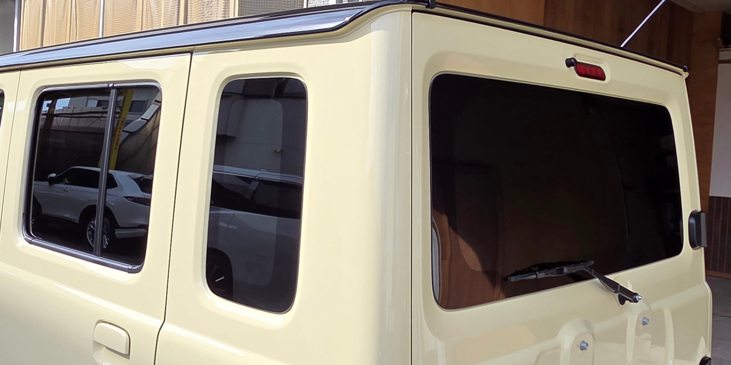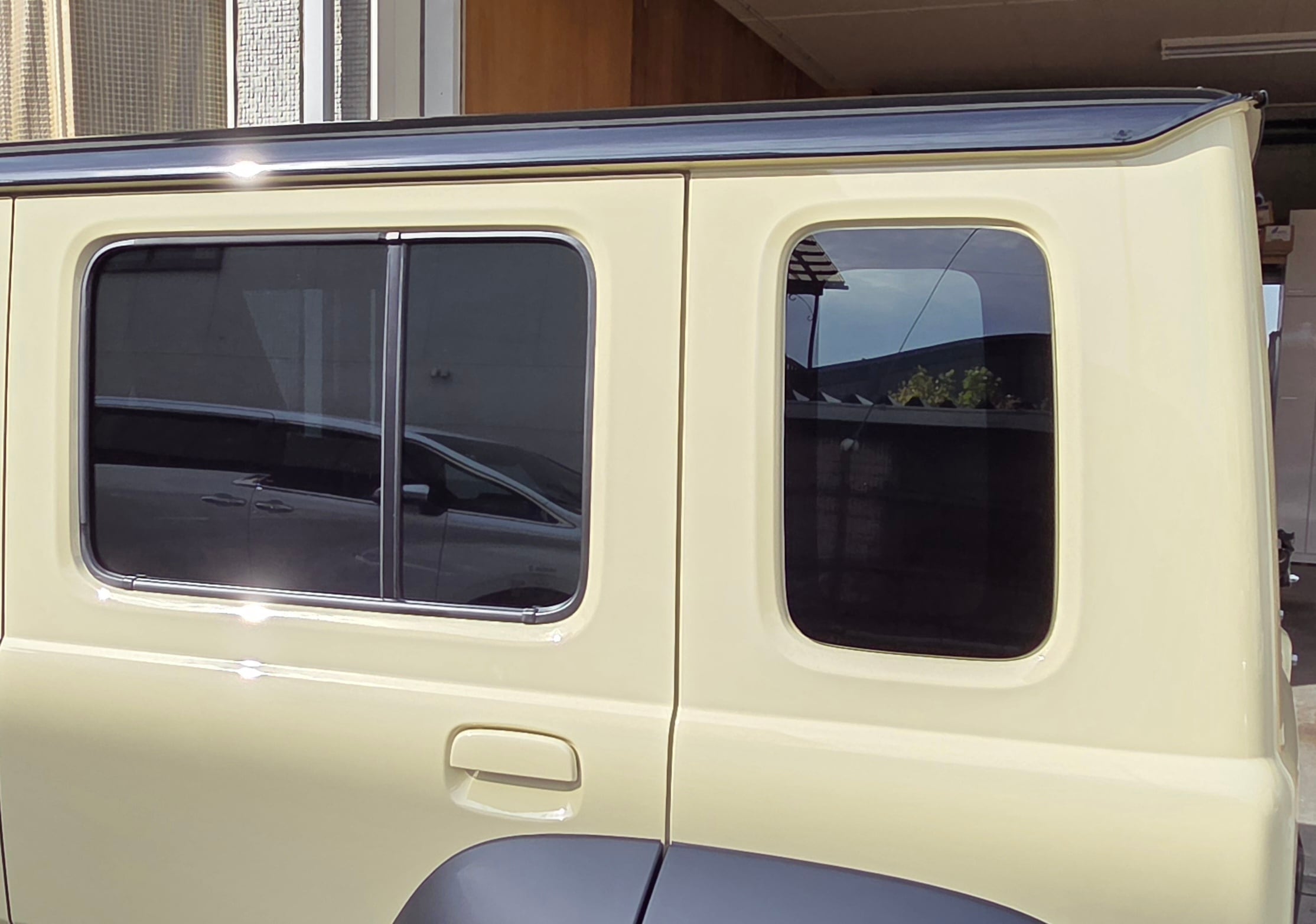 外側からはミラーフィルムですが、内側からは黒色のフィルムを施工した感じになります。