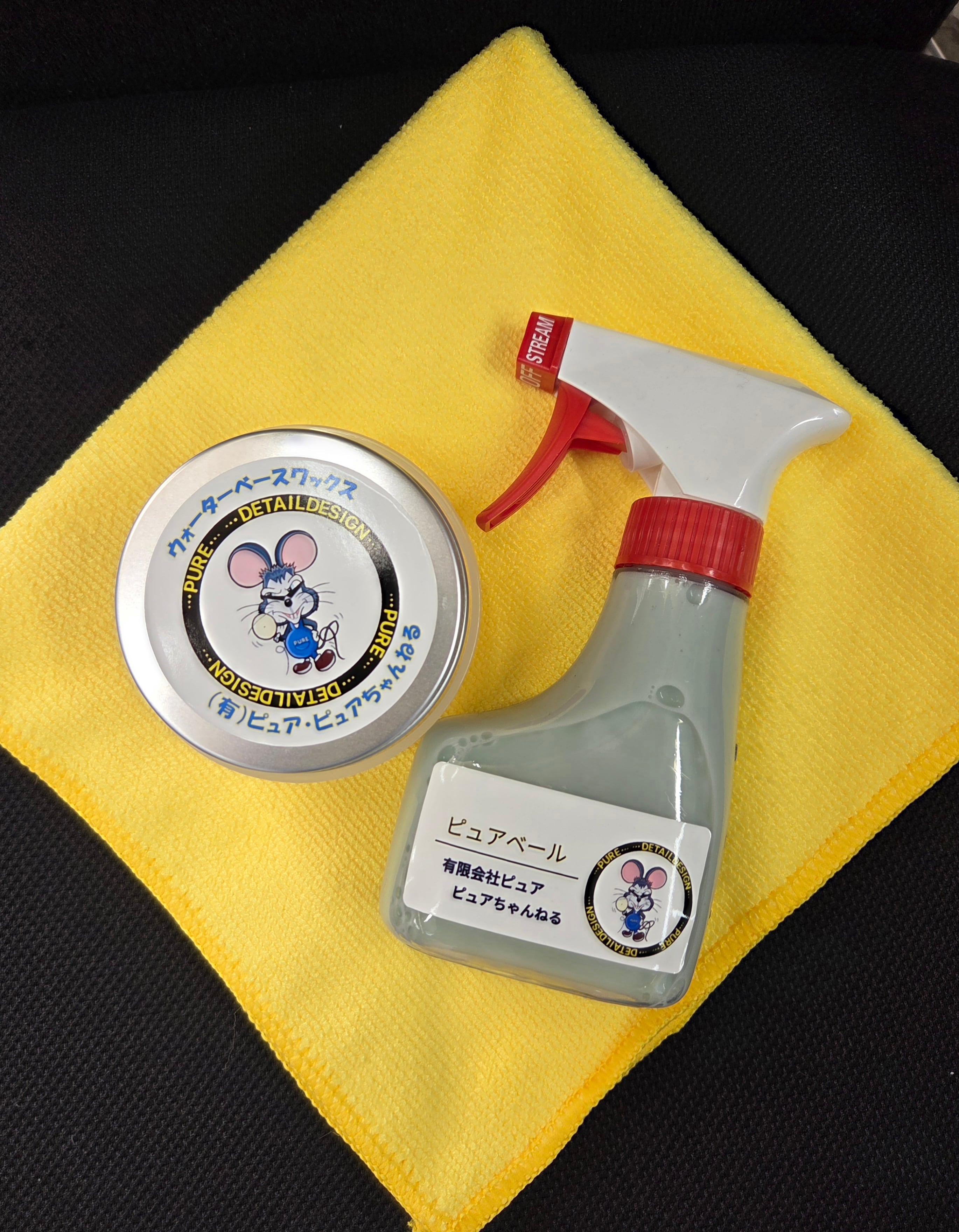 ウォーターベースワックスを塗り広げ拭きのばした後、固く絞った濡れタオルにピュアベールを吹きかけ、ボディーに塗りのばしてください。