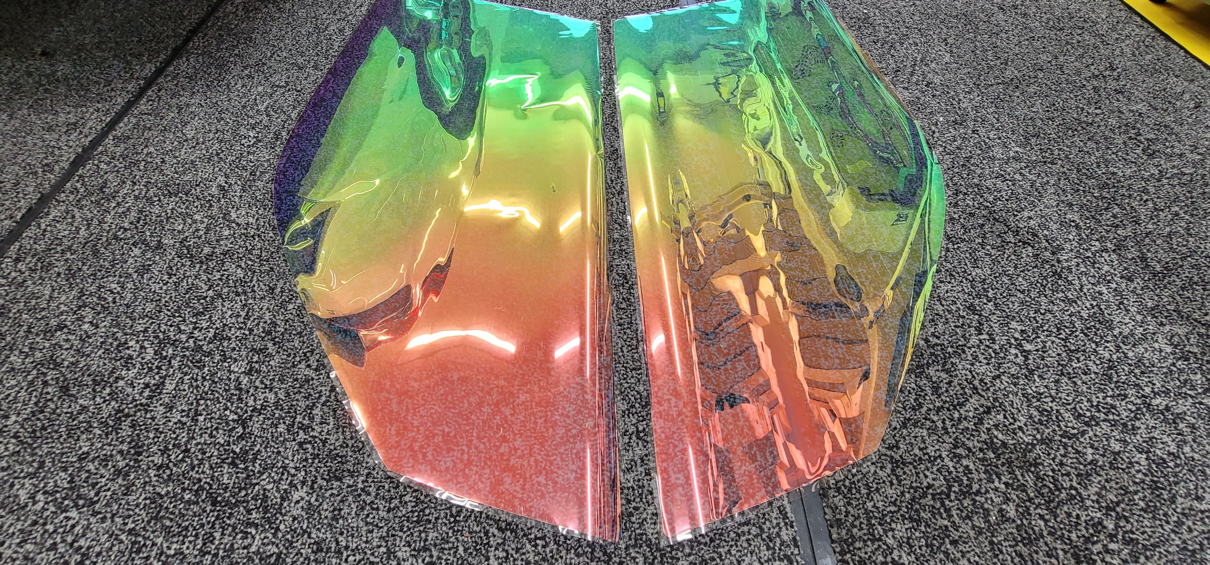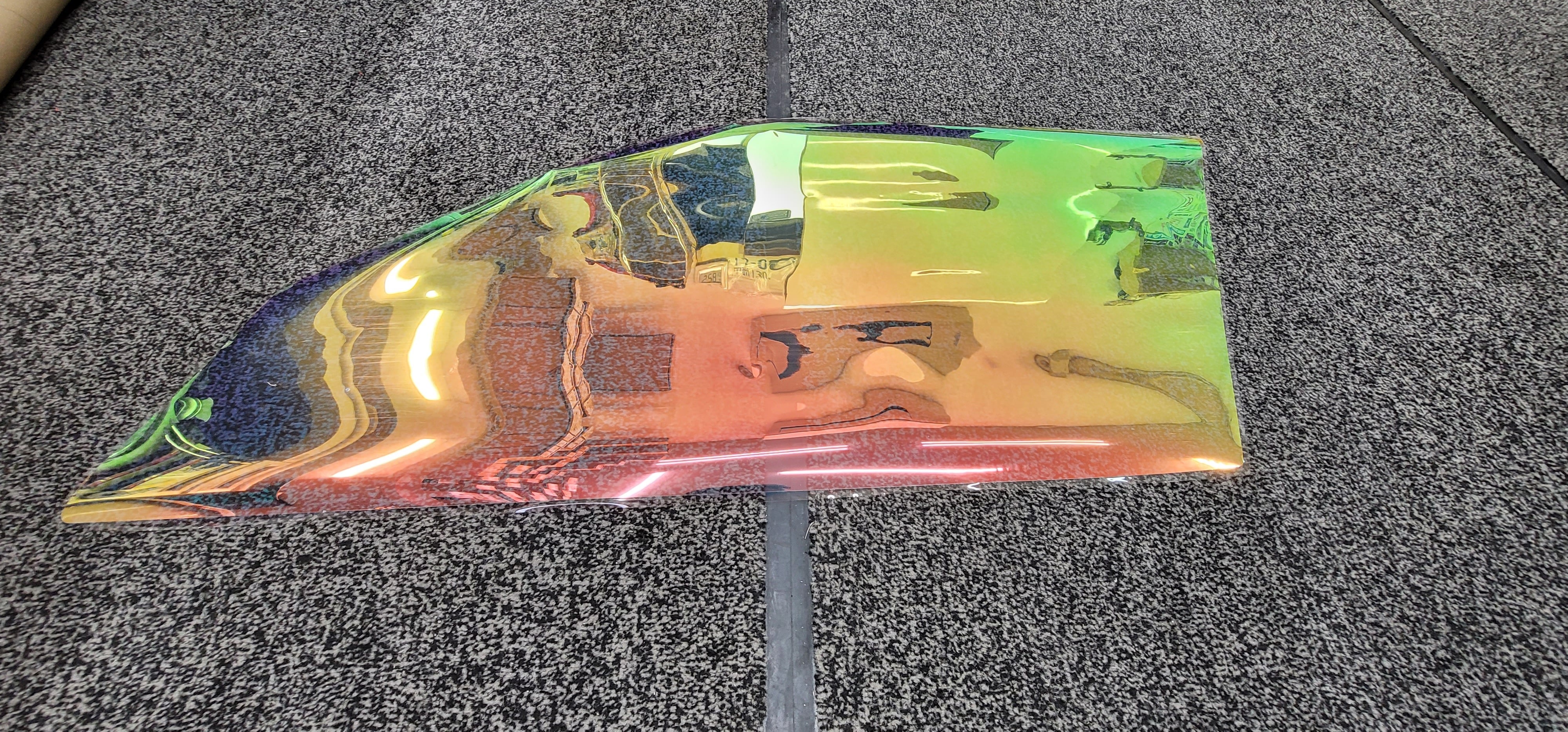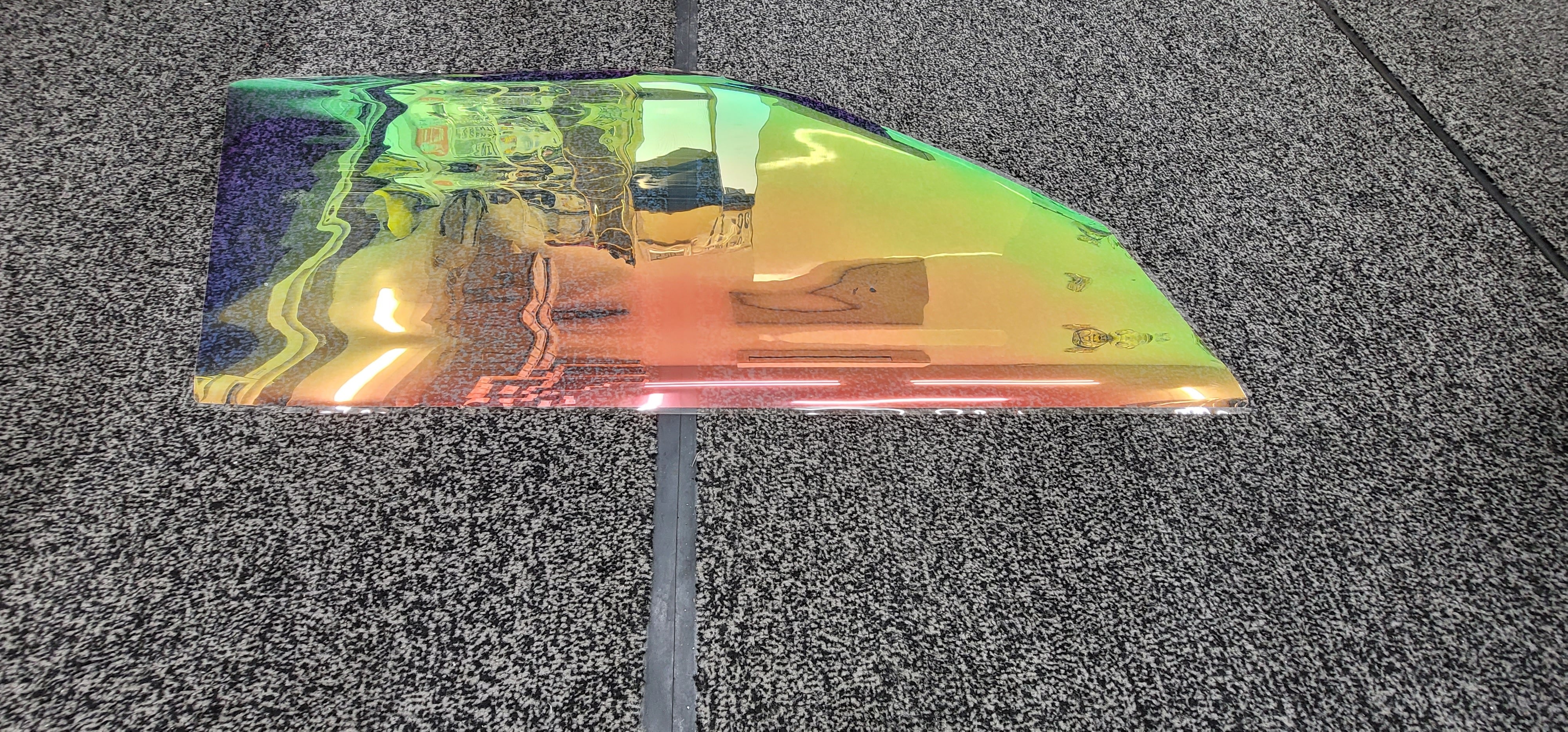 ファンキーゴーストPR99のハイエースフロントドア左右のカット済みフィルムです。 見かけは派手ですが、中からは見やすくて断熱効果も有り、カスタム要素の高いフィルムになります。