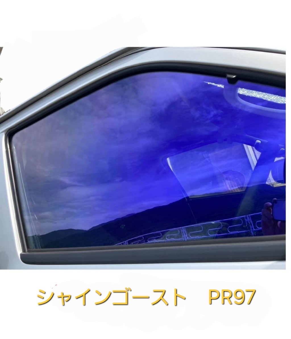 ハイエース・レジアスエース用200系のクリアガラス「ピュアガラス90」に、シャインゴーストPR97のフィルムを施工した運転席・助手席のガラスになります。
