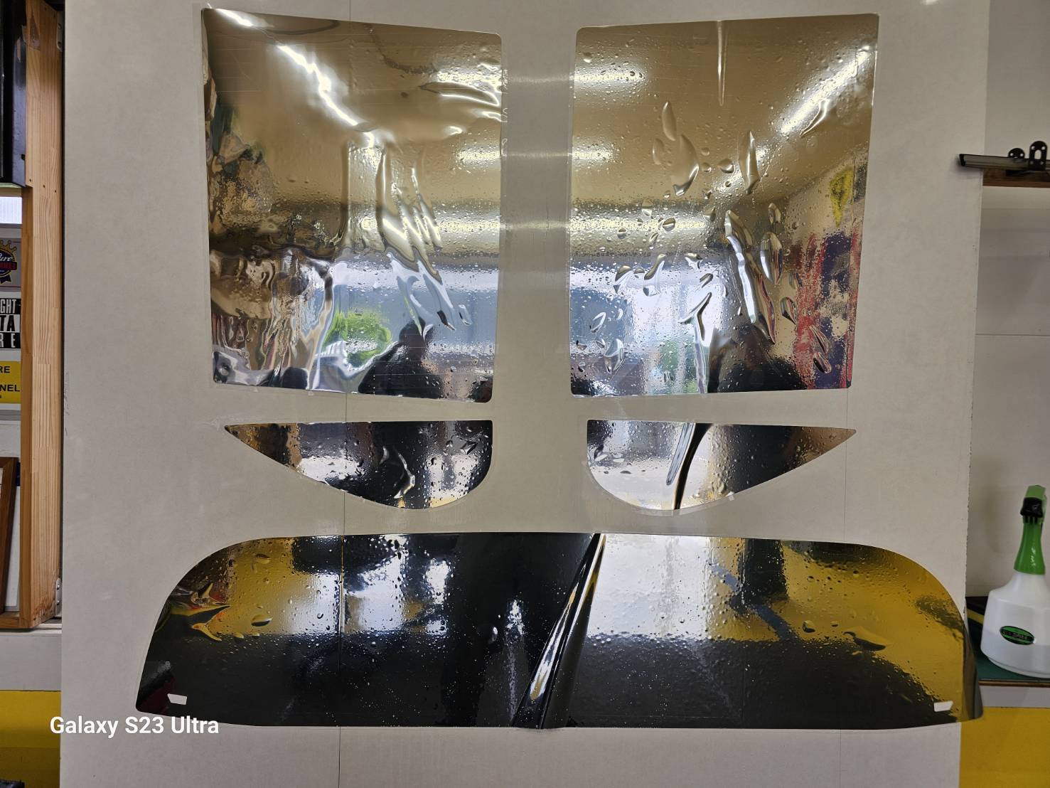 外側からは黒ミラーフィルムですが、内側からは黒色のフィルムを施工した感じになります。